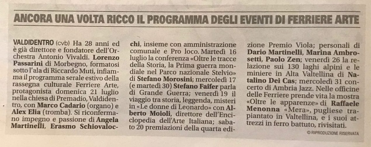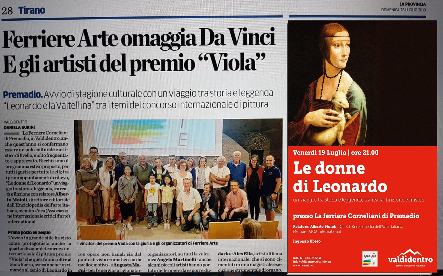 Le Donne di Leonardo – Rassegna stampa – Ferriere Arte – 29 Luglio 20193 Agosto 2019 by Alberto Moioli Un ringraziamento molto speciale all’Organizzazione di FERRIERE ARTE di Valdidentro per avermi ospitato con la conferenza “le donne di Leonardo”. Alberto Moioli Con Angela Martinelli Alla galleria Lavit di Varese FacebookTwitterFollow us