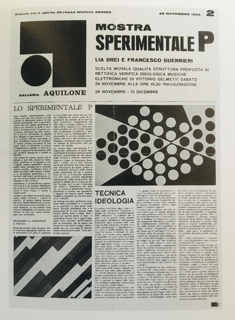 In tale contesto, negli anni ’60, sono emersi, per coerenza e raffinata cultura e ricerca, i movimenti Gruppo 63 e Sperimentale P (Puro) ed in particolare l’opera, straordinaria di due artisti uniti nelle vita e nel linguaggio creativo; Francesco Guerrieri (1931 – 2015) e Lia Drei (1922 -2005).