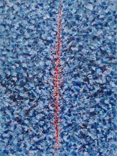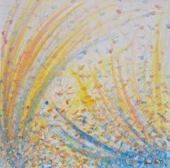 A fronte di ciò, è bene sottolineare, che lo studio costante della storia dell’arte non significa per l’artista avere un’adesione pedissequa ai movimenti ai quali ho fatto riferimento. Nascono così, supportate da fondamenta culturali molto profonde e ben strutturate opere particolarmente importanti nel percorso creativo dell’artista come “primavera”, “palpiti di colore” e “in the sun” in cui l’armonia cromatica danza idealmente sulla tela giocando con una luce e una tecnica pittorica affine ad un nuovo divisionismo contemporaneo. Se con l’opera “SUN”, Anna Ceppi inserisce magistralmente un tocco geometrico dando grande ritmo compositivo, è con “E subito ne uscì sangue e acqua”[6] che l’artista eleva la sua arte a citazione evangelica (Giovanni, 19,33-34) riflettendo sul significato profondo del momento in cui il soldato trafigge con la sua spada il costato di Gesù, ormai morto sulla Croce. L’opera deve essere osservata in silenzio e con attenzione perchè la ferita che divide a metà il dipinto è un simbolo molto profondo attraverso il quale si intravede con evidenza la volontà di Anna Ceppi di suscitare in noi il desiderio di provare a farci contagiare dalla forza dirompente che l’arte può avere.