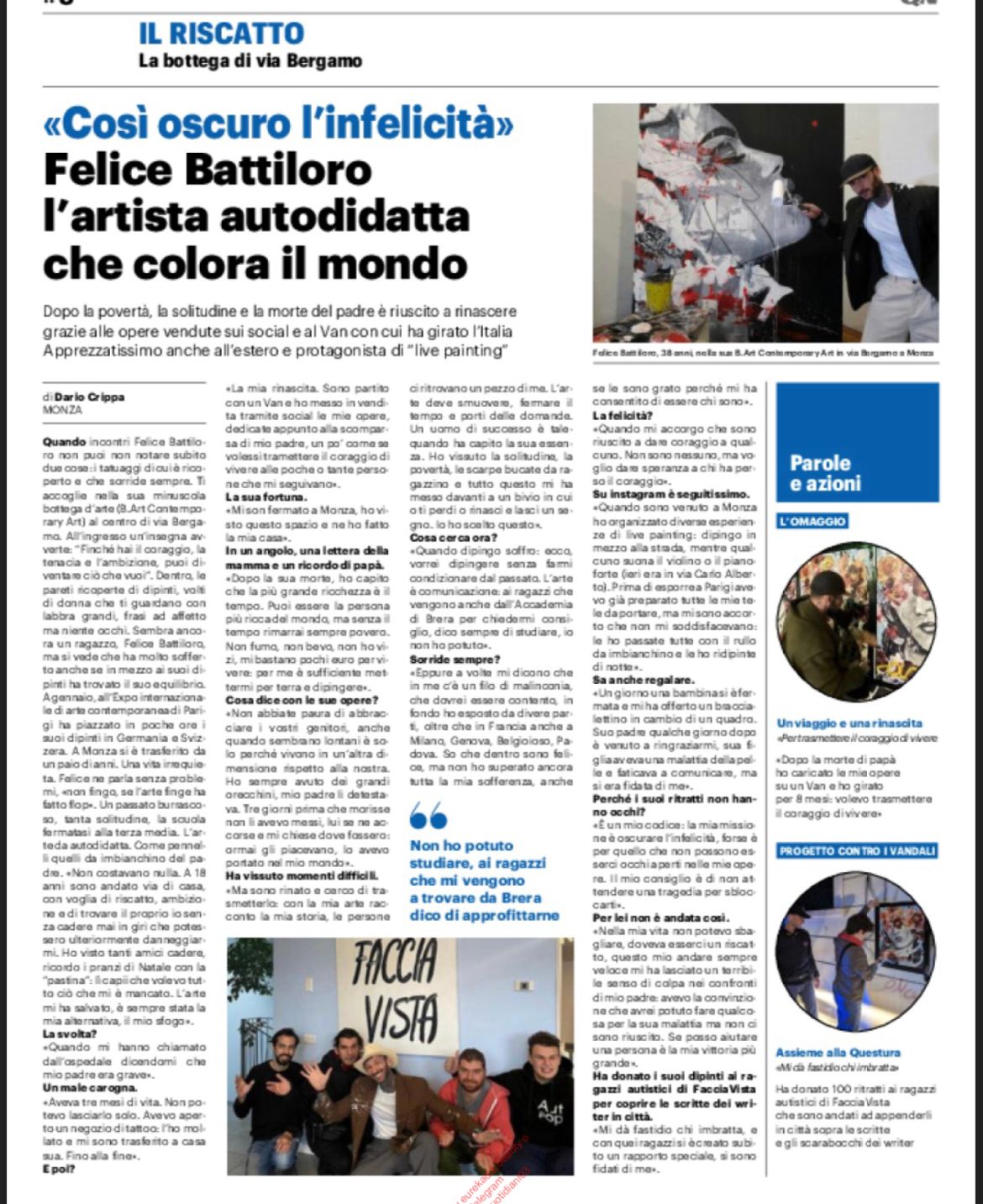 A Monza, a fine marzo 2023, l’artista è il protagonista di un’operazione artistica attraverso la quale le brutture della città, rappresentata dalla volgarità e dalla violenza linguistica delle scritte sui muri, vengono coperte temporaneamente con una vera e propria risposta espressiva rivolta al senso di bellezza, elemento del quale, mai come ora, se ne sente la necessità. L’evento che attraverso l’arte intende sconfiggere il brutto è stato ideato e promosso da Amerigo Concept Store di Matteo Perego di Monza, in collaborazione con gli artisti dell’associazione Facciavista e Felice Battiloro